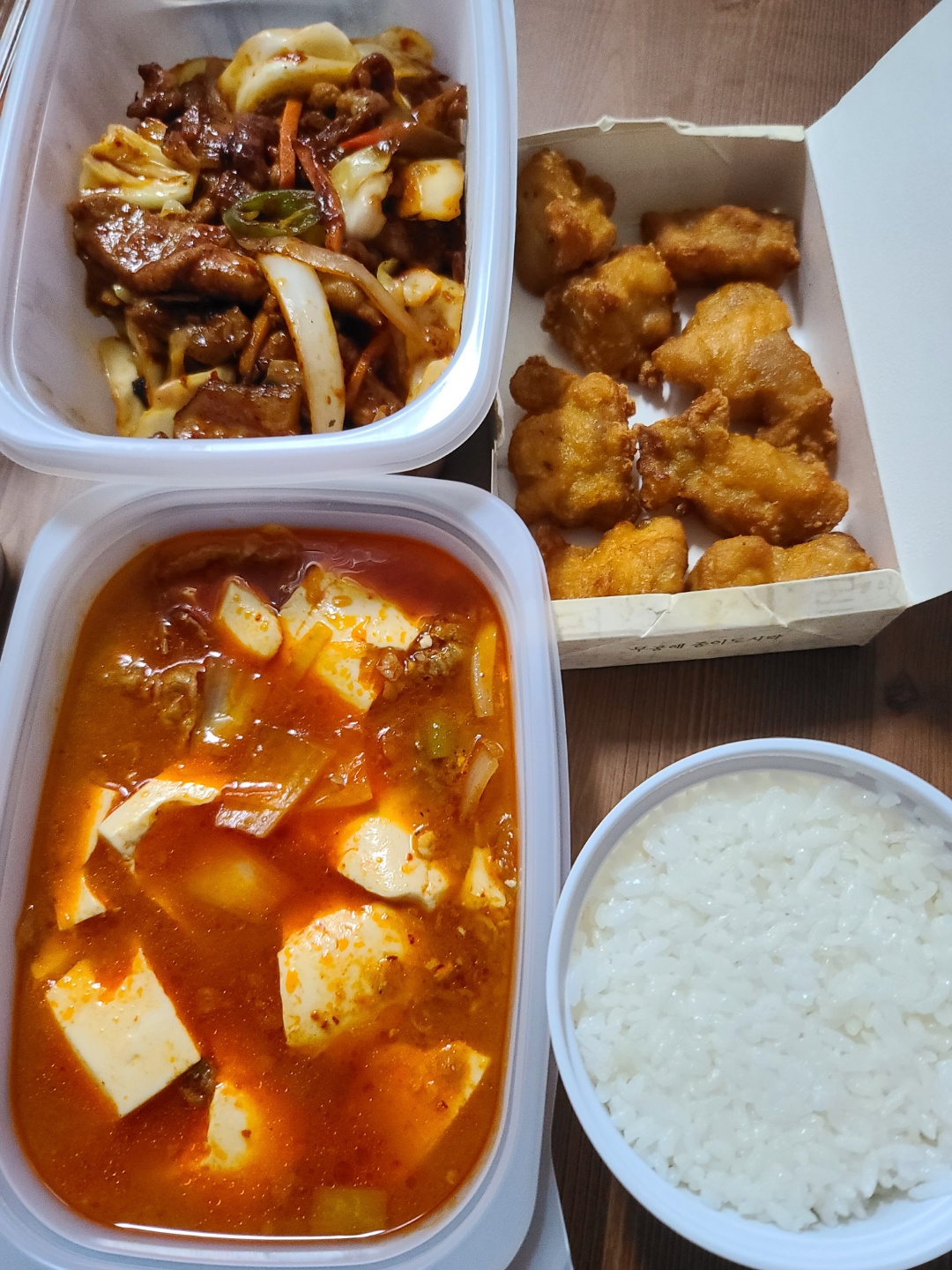 제육 소자에 순두부찌개 가라아게 구성으로 궁합이 잘 맞습니다.