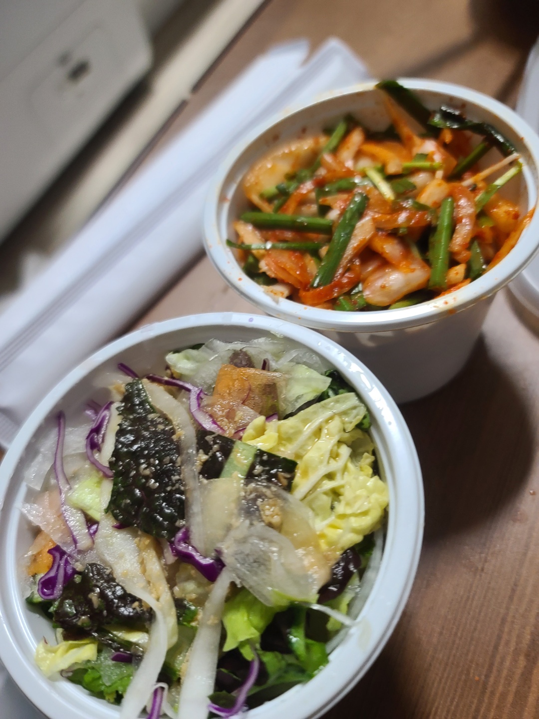 기본찬으로 주시는 부추무침과 샐러드도 꽉꽉 눌러 담아주십니다.