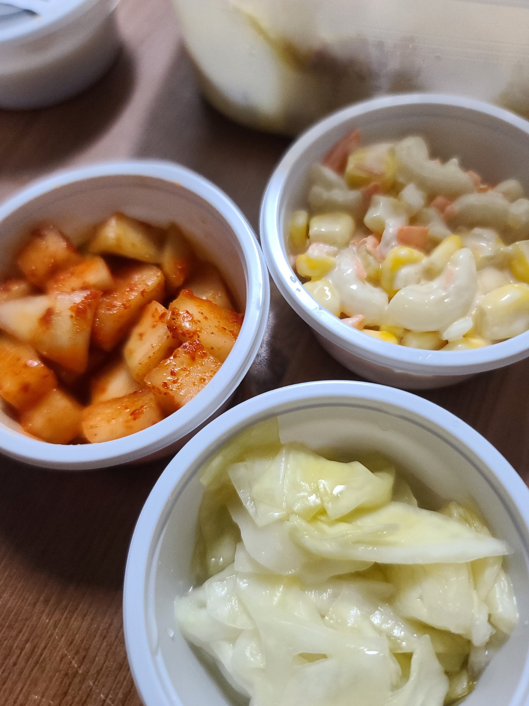 기본찬으로 깍두기와 양배추 절임 마카로니 콘샐러드입니다.