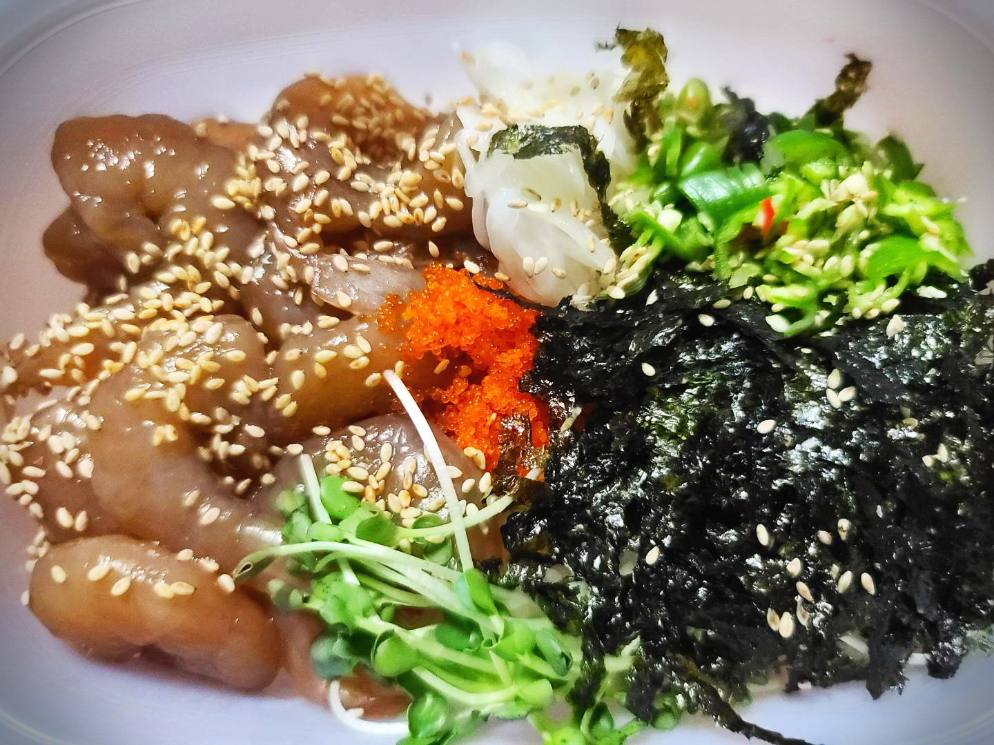 덮밥에는 날치알, 무순, 김가루, 채 썬양파, 청양고추가 들어가는데