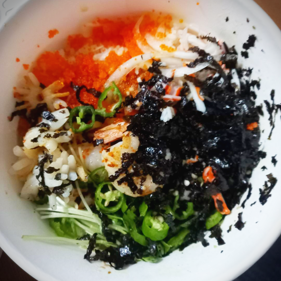 새우도 4마리나 들어있고 날치알과 오징어 김가루, 게맛살, 청양고추가 들어가 있습니다.