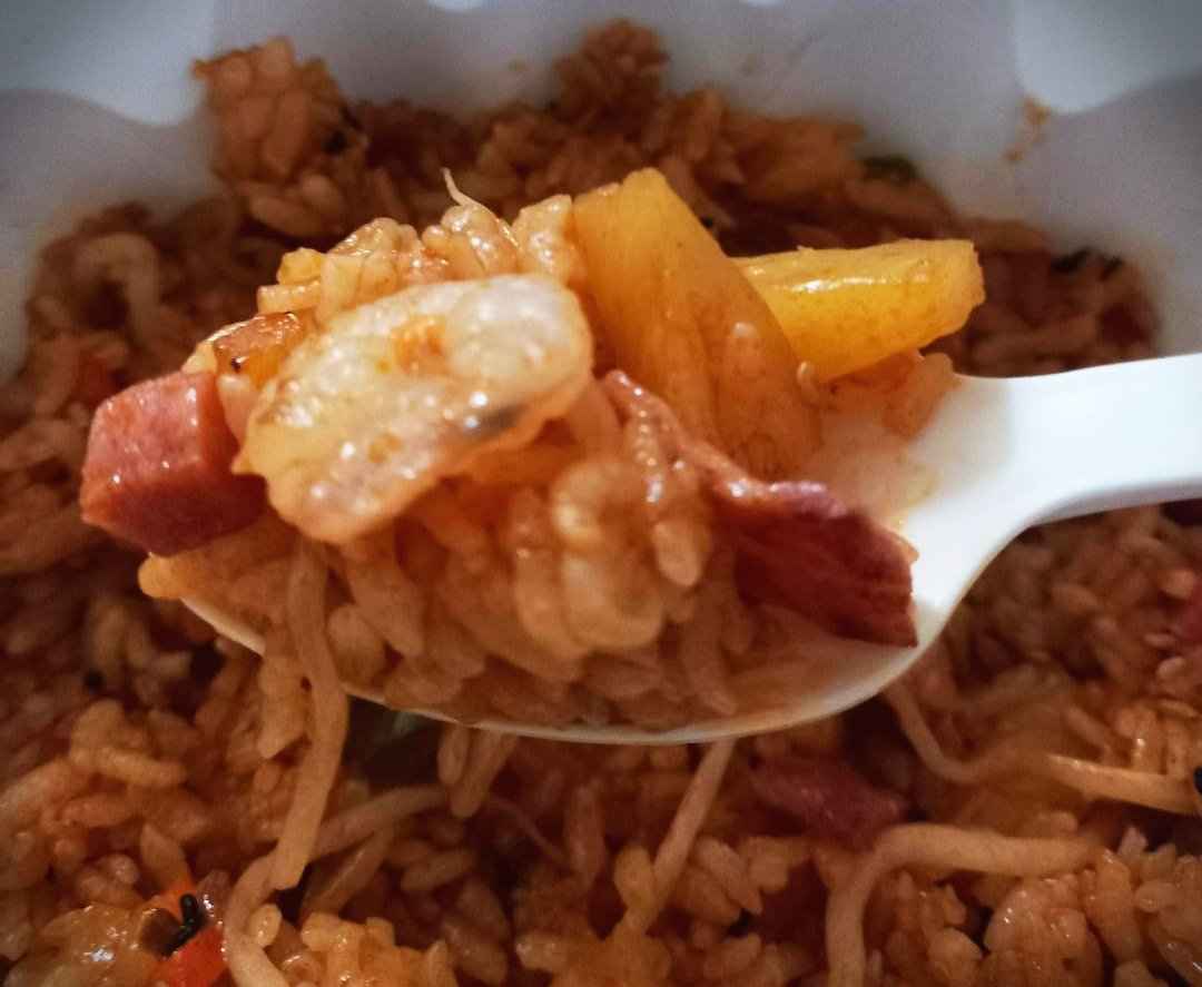새우, 베이컨, 햄, 숙주, 당근, 다진 피클, 파인애플 등이 들어가 있습니다.